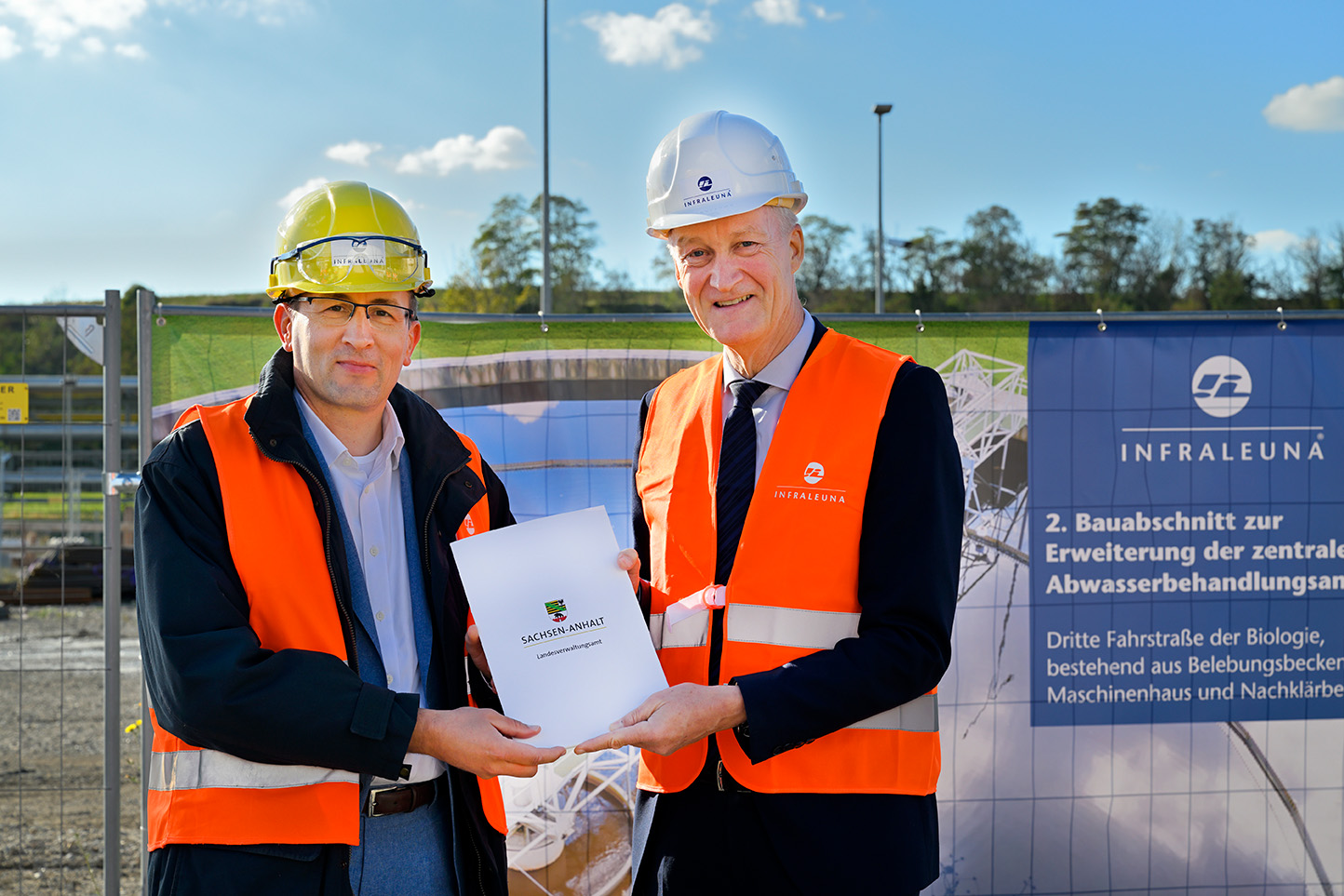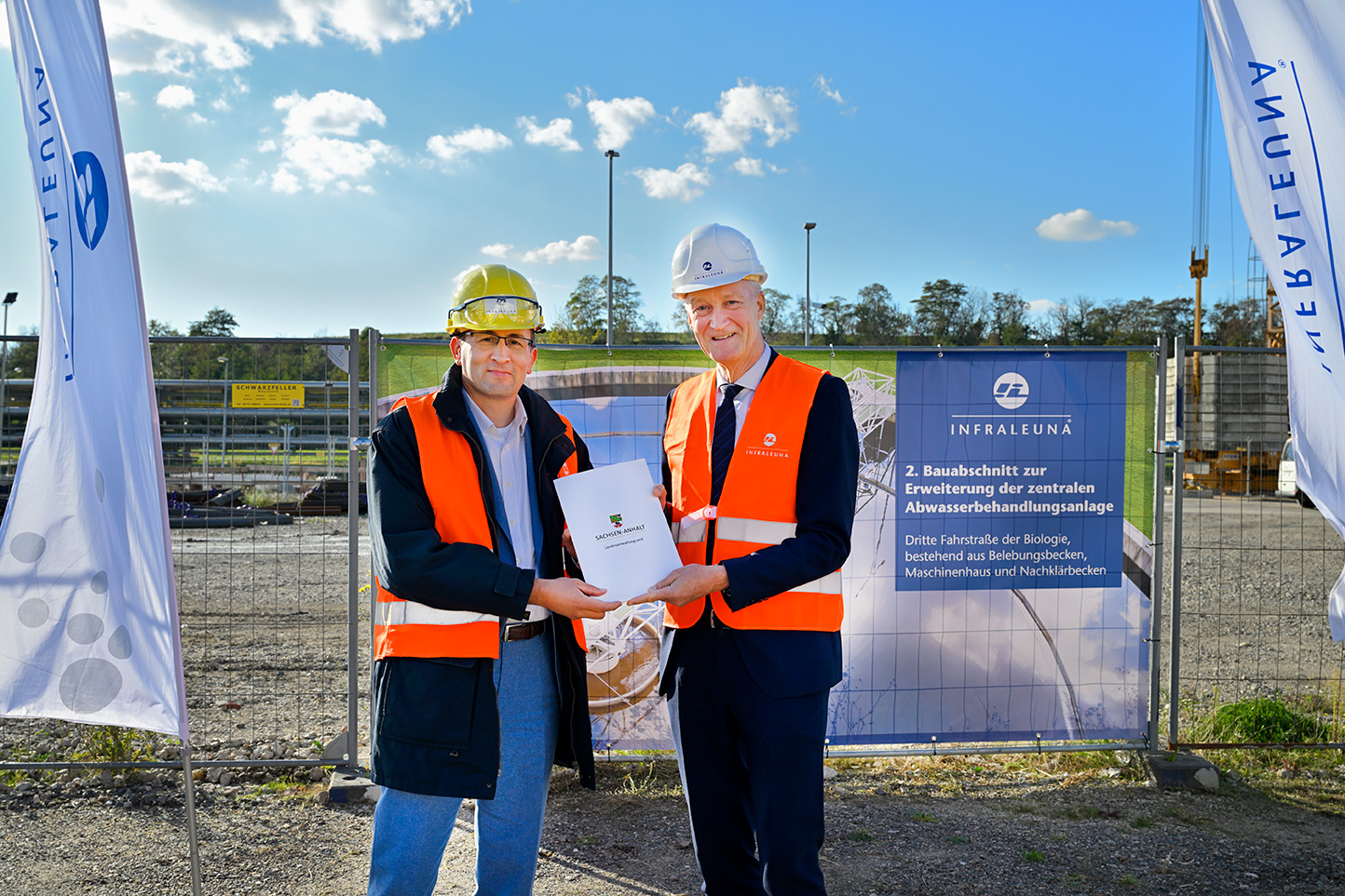 Martin Naundorf, Bereichsleiter Vertrieb/ Standortentwicklung/ Öffentlichkeitsarbeit bei der InfraLeuna GmbH, und Thomas Pleye, Präsident des Landesverwaltungsamtes Sachsen-Anhalt bei der symbolischen Übergabe des Genehmigungsbescheids für den zweiten Bauabschnitt zur Erweiterung der Zentralen Abwasserbehandlungsanlage am Chemiestandort Leuna – Bildquelle: InfraLeuna