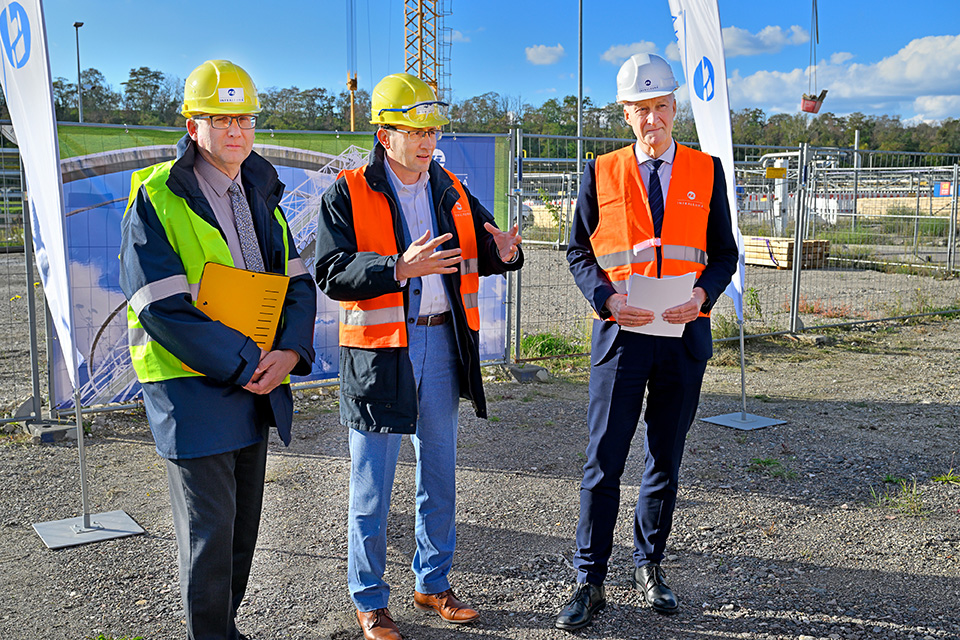 An der Baustelle des Erweiterungsbaus der Zentralen Abwasserbehandlungsanlage am Chemiestandort Leuna v.l.: Dr. Detlev Brodkorb, Leiter Behördenmanagement bei der InfraLeuna GmbH, Martin Naundorf, Bereichsleiter Vertrieb/ Standortentwicklung/ Öffentlichkeitsarbeit bei der InfraLeuna GmbH, Thomas Pleye, Präsident des Landesverwaltungsamtes Sachsen-Anhalt – Bildquelle: InfraLeuna