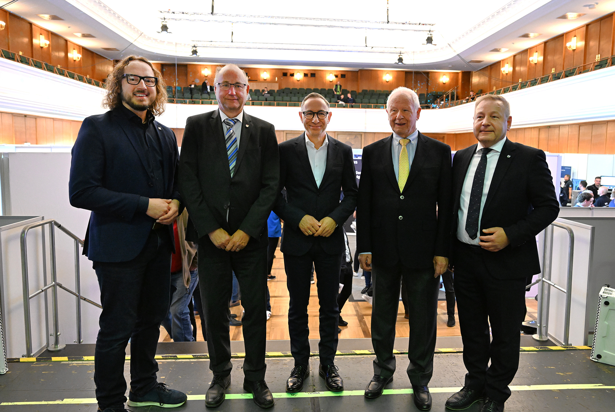 Eröffnung der Standortmesse „Leuna-Dialog“ 2026 (v.l.): Sebastian Müller-Bahr, Oberbürgermeister der Stadt Merseburg, Hartmut Handschak, Landrat des Saalekreises in Sachsen-Anhalt, Dr. Christof Günther, Geschäftsführer InfraLeuna GmbH, Klaus Paur, Geschäftsführer der LEUNA-harze GmbH, Michael Bedla, Bürgermeister der Stadt Leuna – Bildquelle: Lothar Teschner